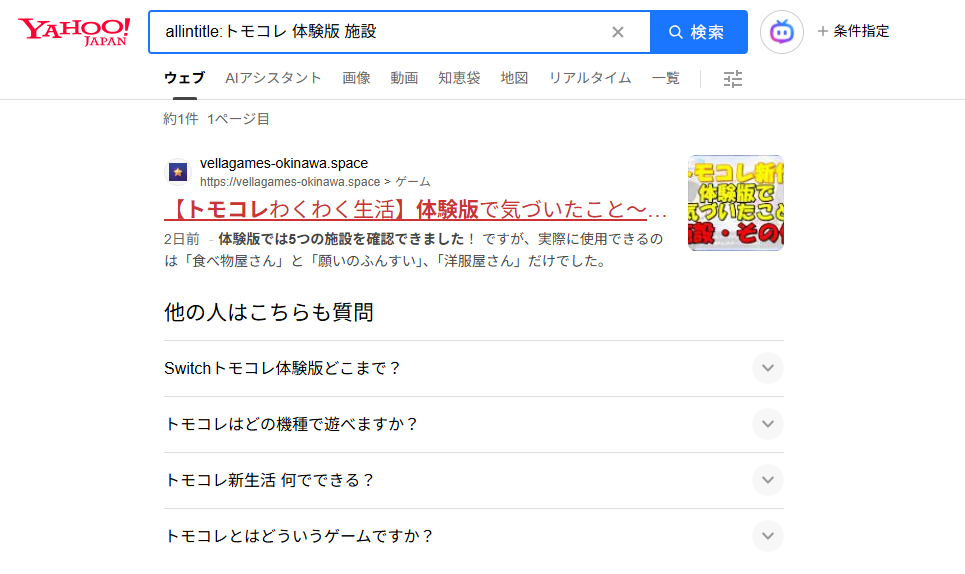 画像の場合は「allintitle:トモコレ 体験版 施設」と入力してみました。
