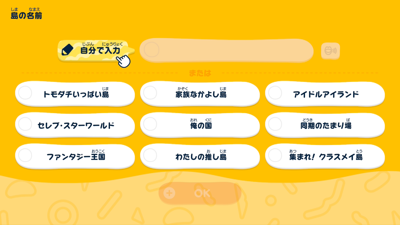 島の名前はプレイヤー自身が入力する以外にも、画面下にある名前の候補から選ぶこともできますよ!