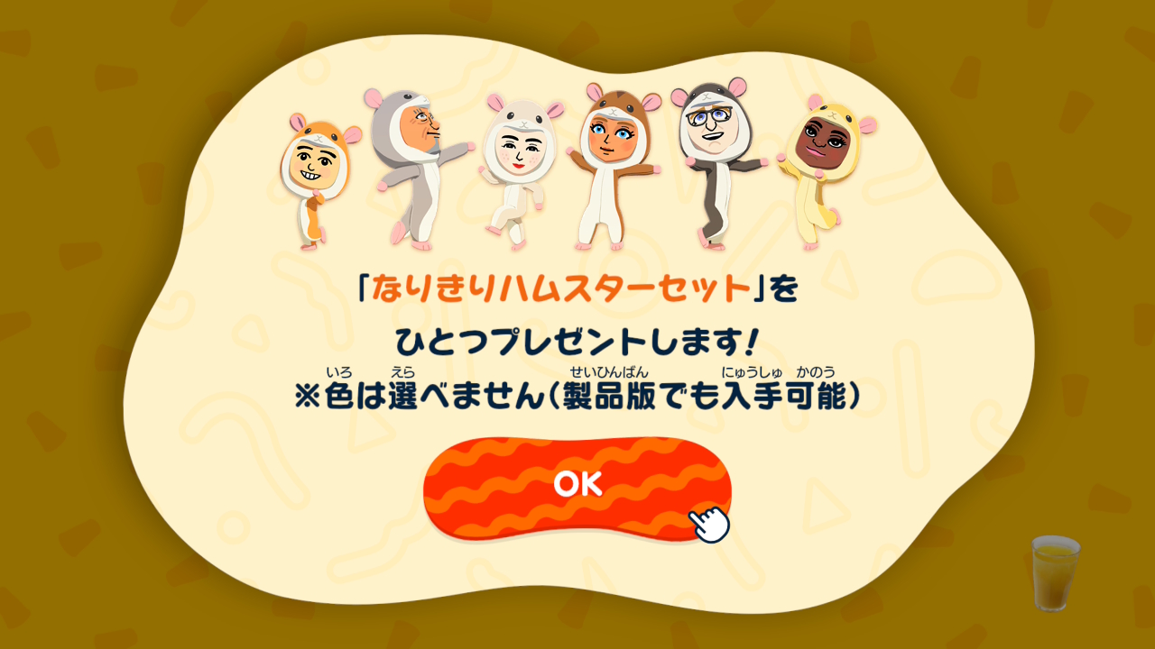 体験版を最後までプレイすると、製品版の特典として「なりきりハムスターセット」を1つもらえます!
